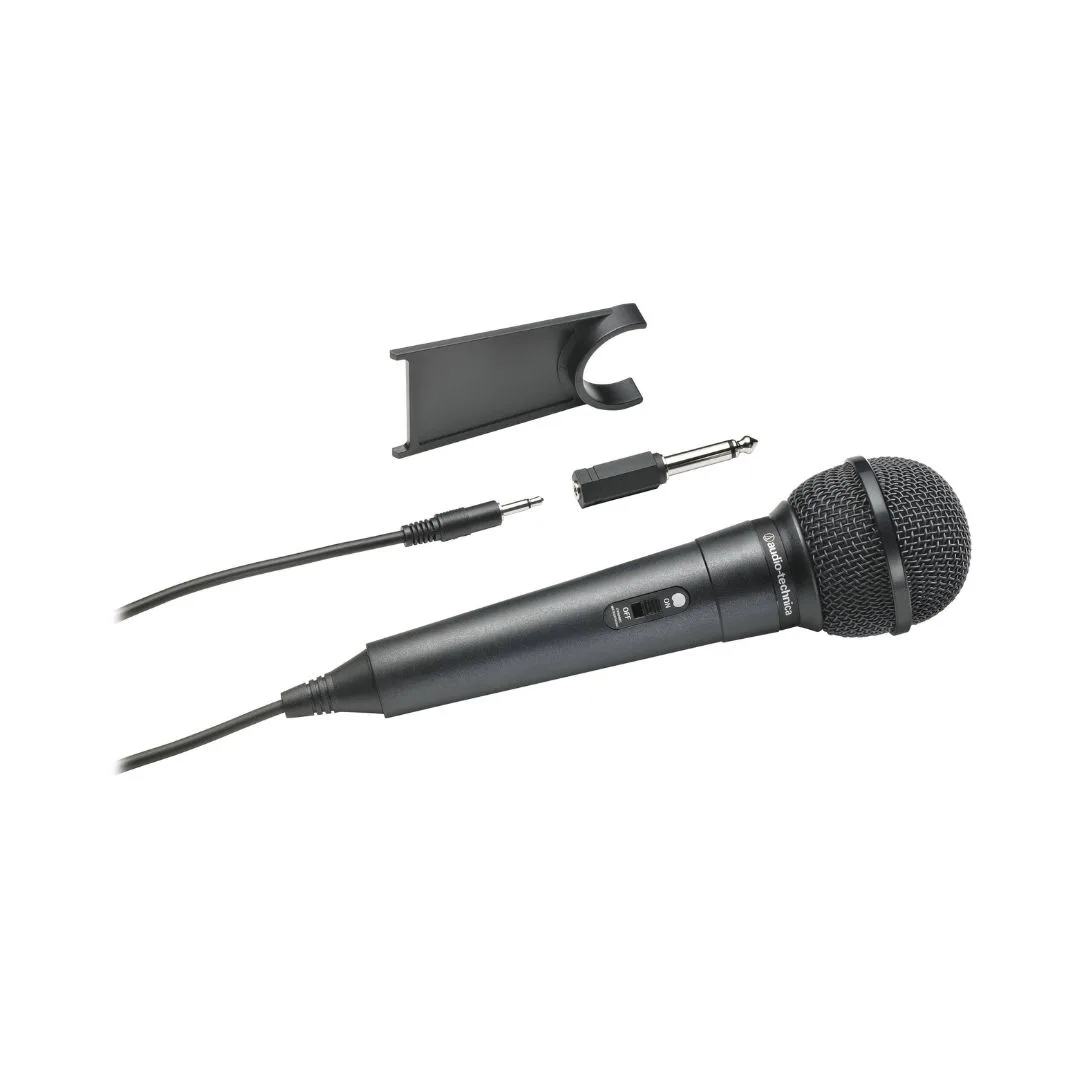 The ATR1100x handheld microphone is tuned for clear audio reproduction. The mic’s unidirectional polar pattern focuses pickup on the sound source and protects against feedback, making the ATR1100x a fine, all-purpose mic for vocals and instruments. Featuring an on/off switch and a permanently attached 3 m (9.8′) cable with a 3.5 mm (1/8″) mini-plug, the ATR1100x is an excellent choice for use with karaoke machines, computers, and PA systems. The mic comes with a desk stand and a 6.3 mm (1/4″) adapter.