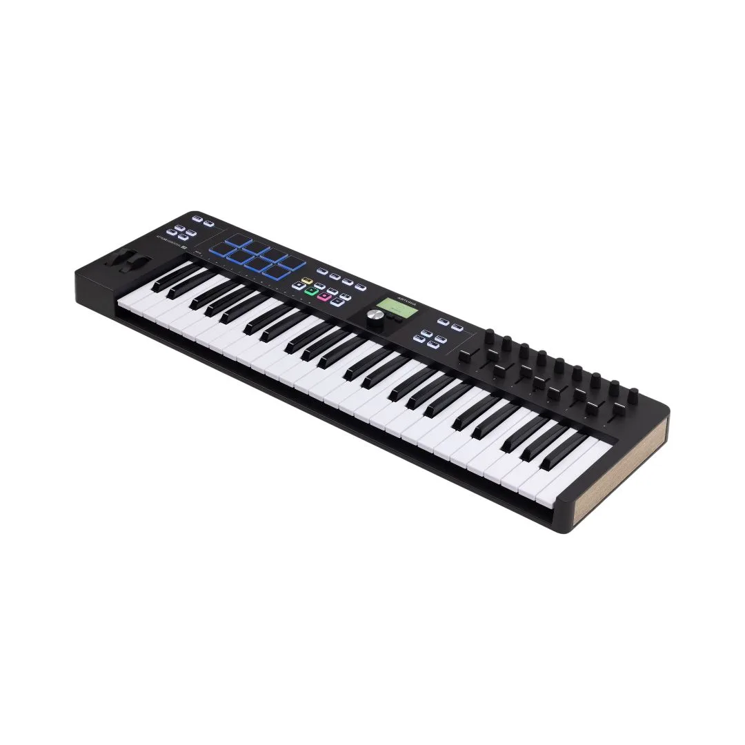 The Arturia KeyLab Essential mk3 is a versatile MIDI controller and software package with 49 synth-action keys and a variety of controls including encoders, sliders, pads, switches, and wheels. It offers 1:1 control of included virtual instrument software and DAWs, with customization options available. KeyLab Essential mk3 utilizes MCU and HUI protocols for seamless DAW control across platforms. It’s compatible with Mac, Windows, iOS, and Android devices, functioning as a Class-Compliant USB device.