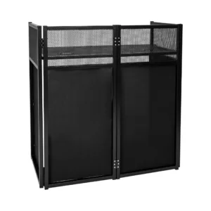 The Headliner Huntington Portable DJ Booth serves as a compact and versatile workstation suitable for both home and mobile DJ setups. Its four-panel folding design, constructed with black metal frames, provides a convenient and space-efficient setup option.