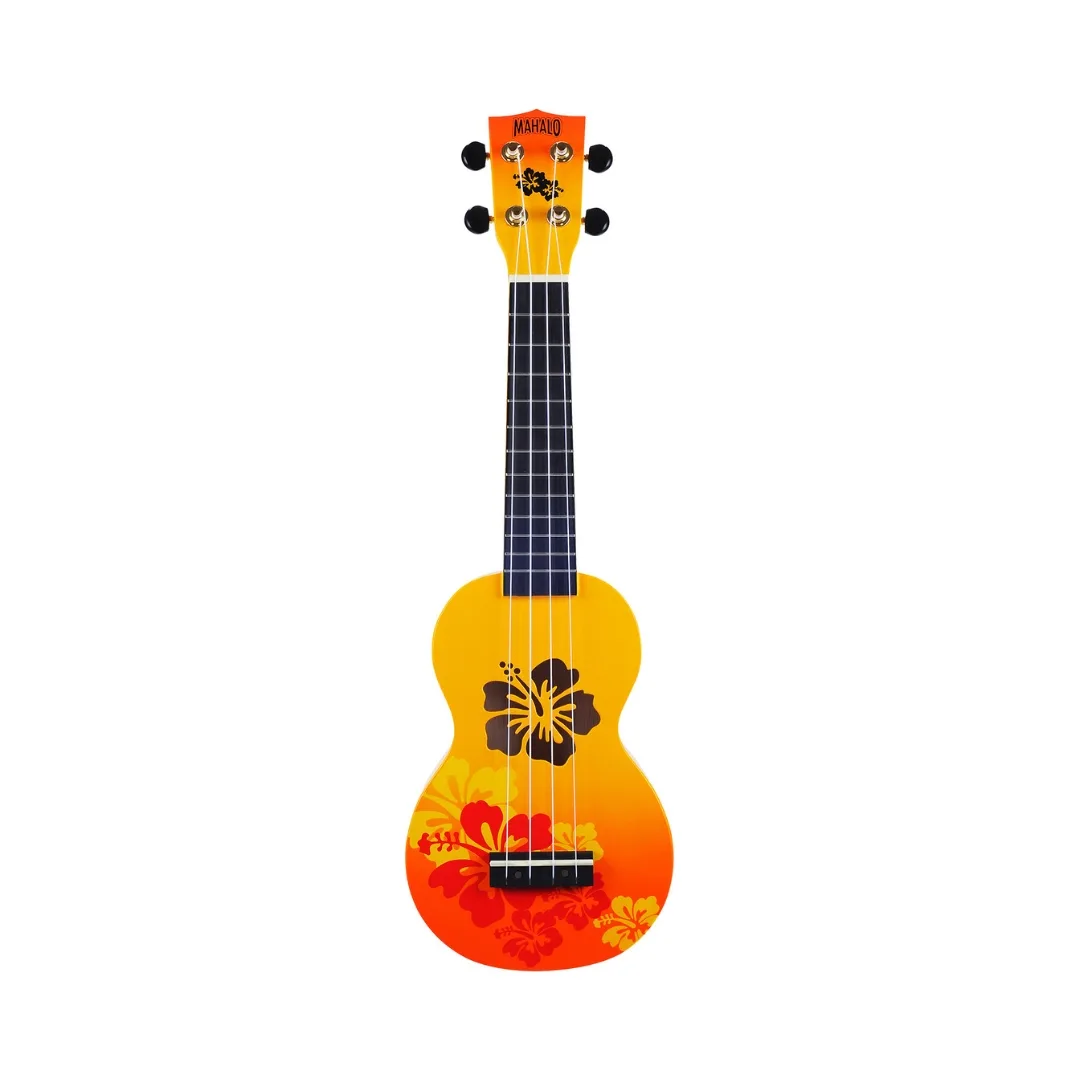 The Mahalo Designer Series Soprano Ukuleles pay homage to Hawaii with a captivating "Hibiscus" theme. Each ukulele in this collection features elegant decorations inspired by the iconic hibiscus flower, the official state flower of Hawaii. Thoughtfully adorned with stylized soundholes and intricate details, these instruments allow players to immerse themselves in the essence of the islands as they strum.