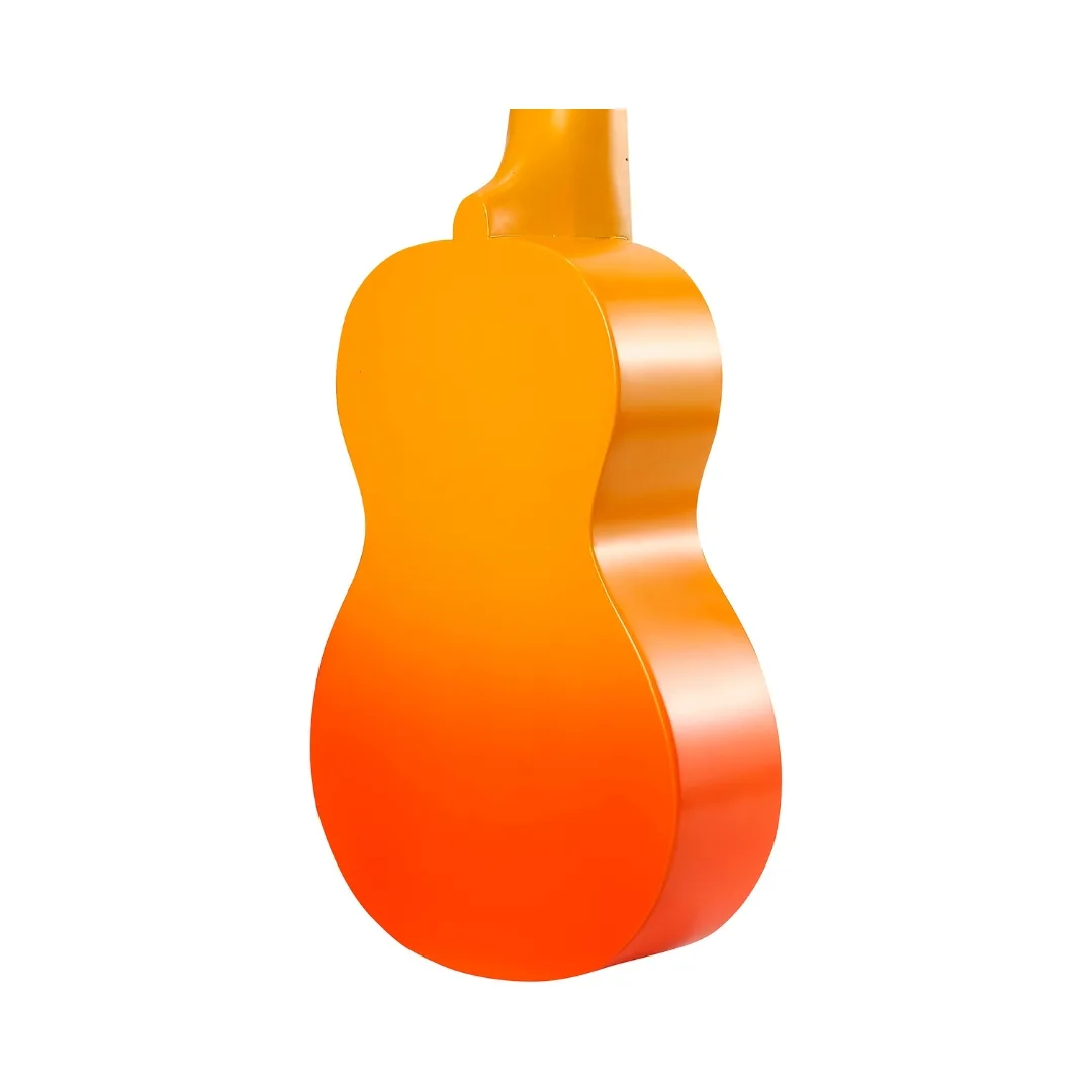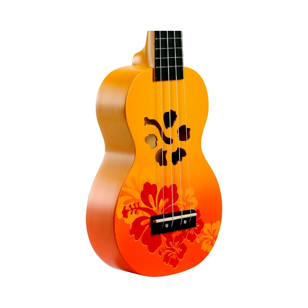 - The captivating sunburst colors, stylized soundholes, and hibiscus flower decorations create an enchanting and visually pleasing design.