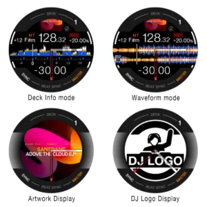 Customize jog wheel displays with 4 modes for continuous deck monitoring, including 3 Band Waveforms (rekordbox only). Monitor Mix Point Link, vocal position analysis, and Performance Pad status. Modes include Deck Info (shows deck and waveform details), Waveform Mode (zoomed waveforms for 2 decks), Artwork Display (track artwork), and DJ Logo Display (custom logos via Image Transfer Tool).