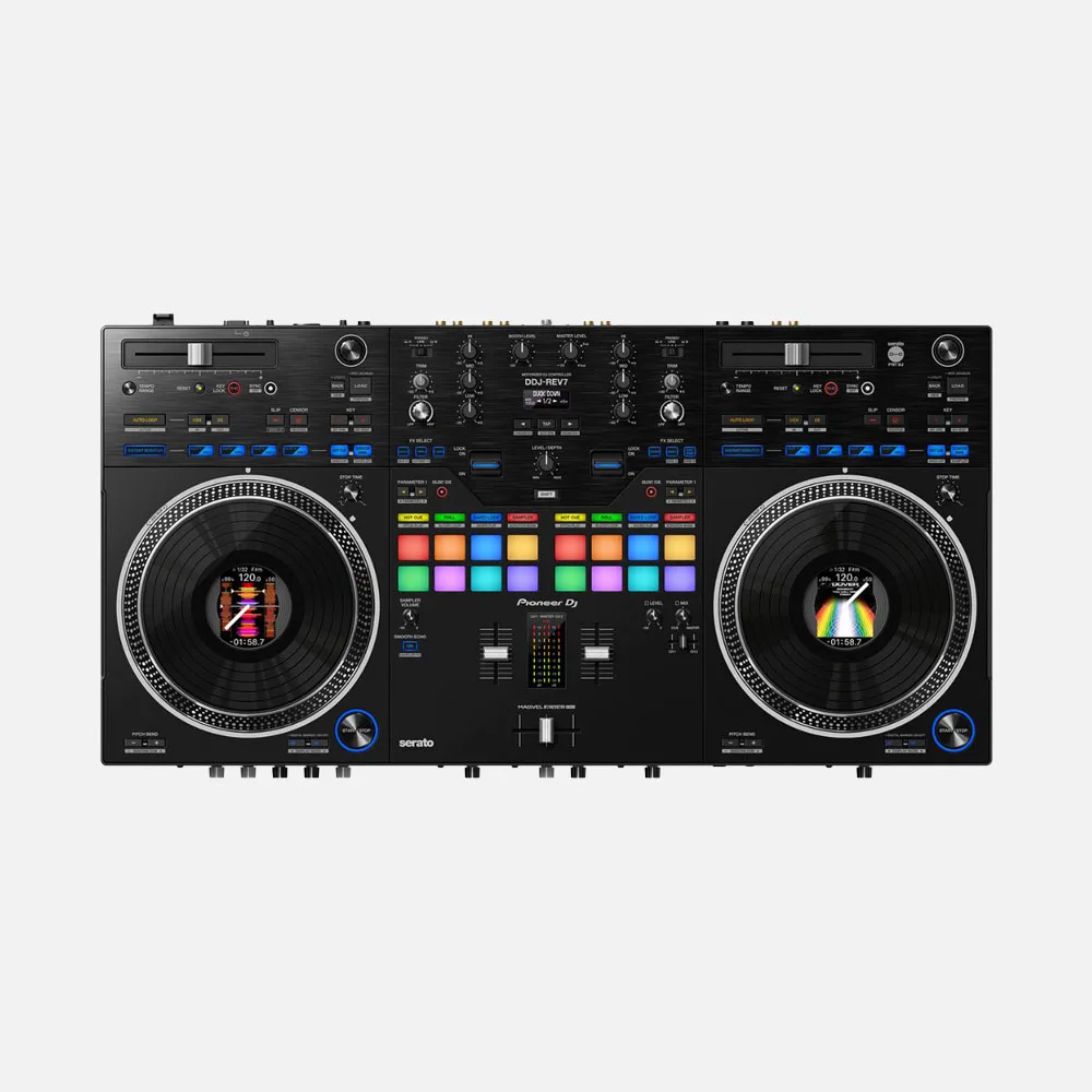 The DDJ-REV7 is built to help you get the most from the Serato DJ Pro and rekordbox performance software and boasts a brand-new design that includes large, motorized jog wheels with On Jog Display to create a tactile connection between you and your music. The layout of this 2-channel unit emulates a professional DJM-S mixer + PLX turntable setup, and includes specialized features for open-format and scratch DJs.