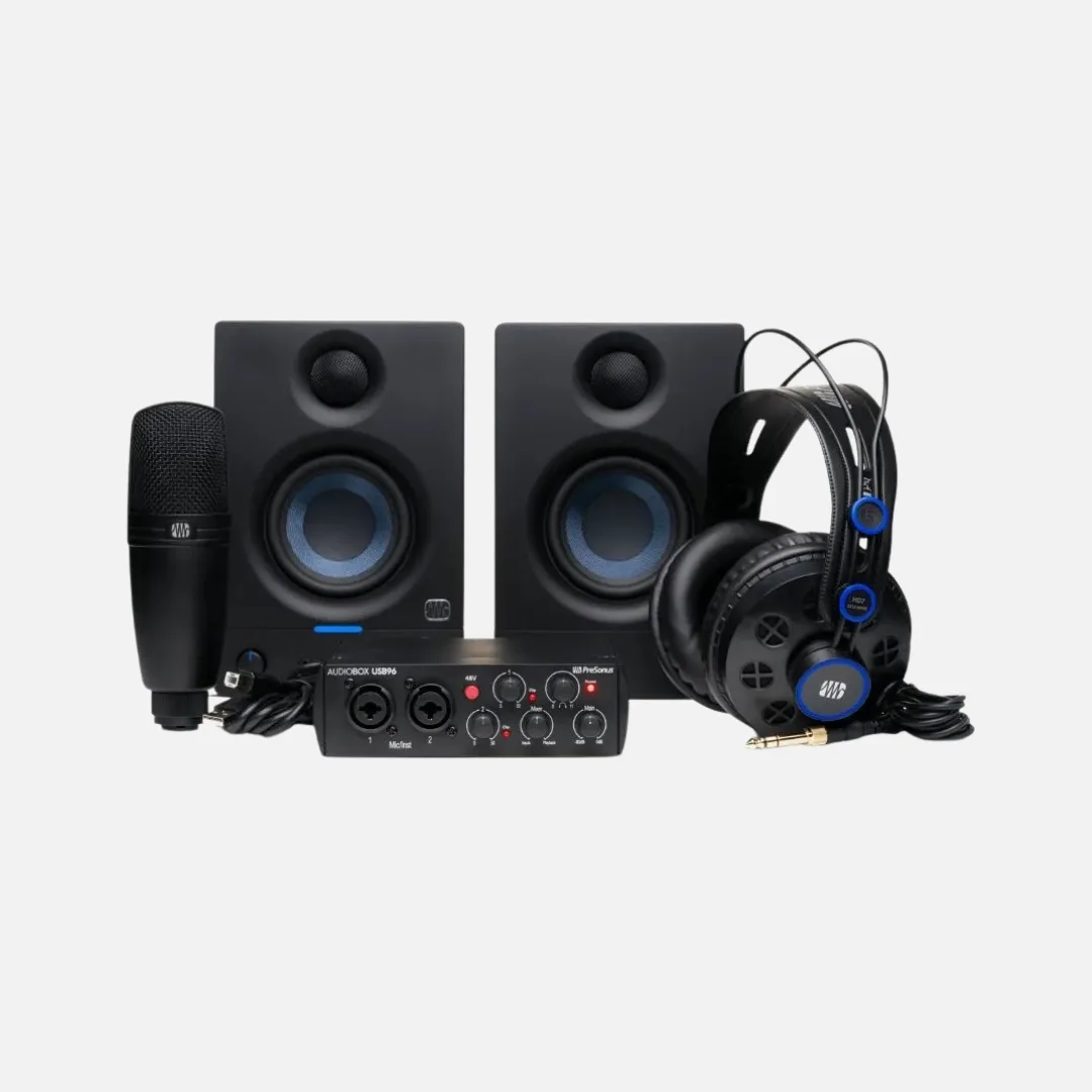 The PreSonus AudioBox USB 96 Complete Hardware/Software Recording Bundle provides everything you need for professional music production or podcasting. It includes the versatile AudioBox USB 96 interface, M7 condenser microphone, HD7 headphones, Eris 3.5 active monitors, and Studio One Artist software, offering an integrated solution for recording, mixing, and monitoring in one package.