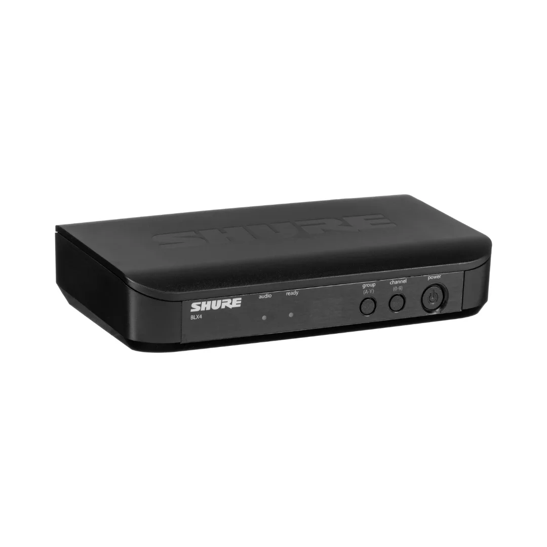 The BLX4 receiver employs microprocessor-controlled internal antenna diversity, ensuring superior wireless audio quality and reliability. Its LED display showcases group and channel settings, while indicator lights signify system readiness and incoming audio strength. Connectivity options include 1/4" and XLR outputs for PA systems and mixing boards.